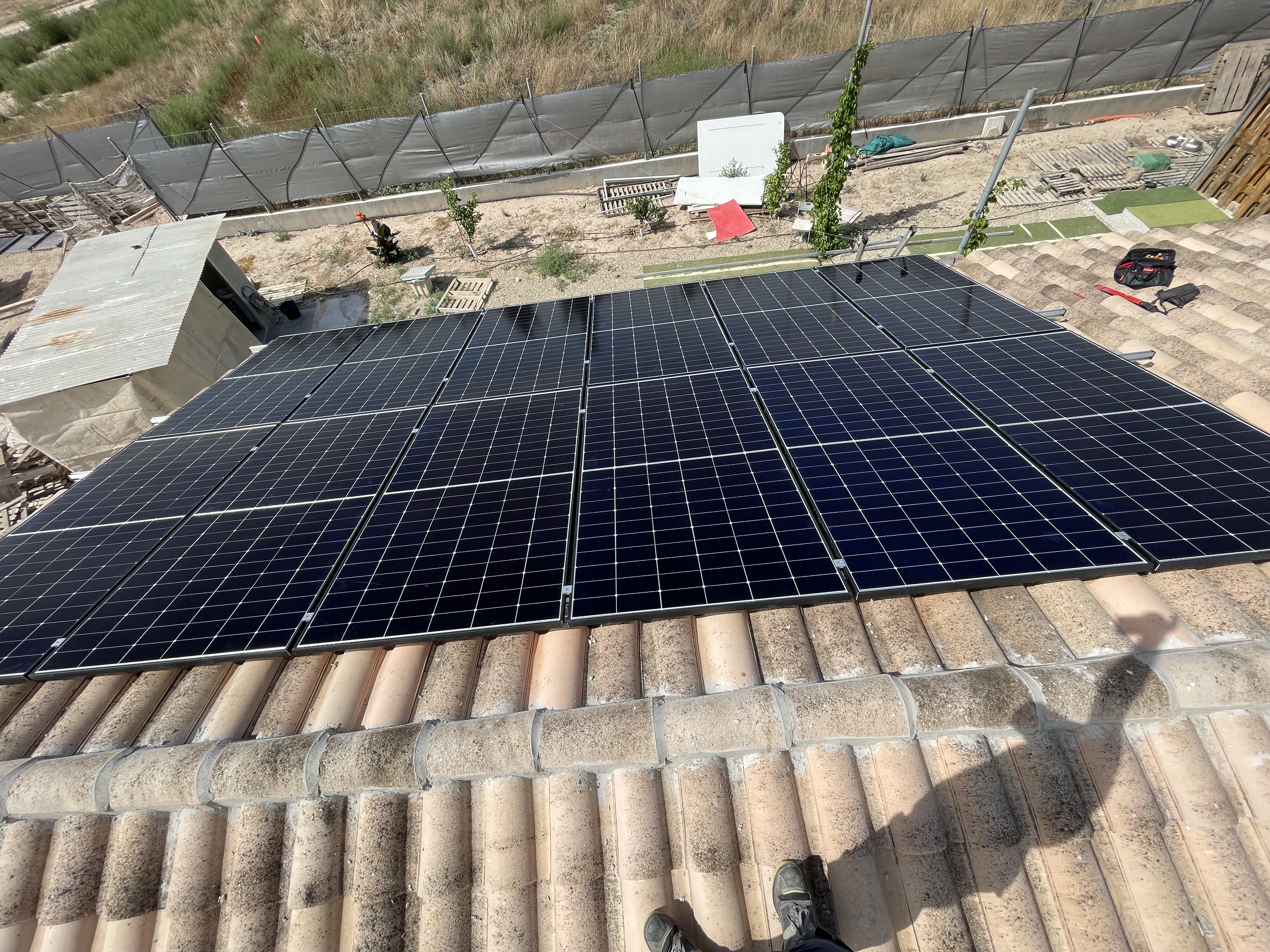 Sistema fotovoltaico de autoconsumo con paneles de alta eficiencia, inversor y sistema de monitorización de producción.
